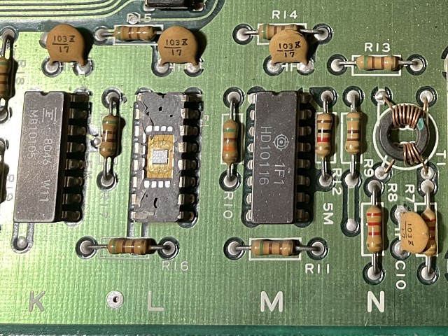 The date code on the new part is from 1985 so just slightly newer than the original item and it also has a ceramic package. In this instance I'm soldering the replacement in position without adding a socket, mainly to retain the original appearance of this section of the clock PCB which employs a number of ECL logic components in ceramic packages. That done and powering the board set on again the game runs as before.