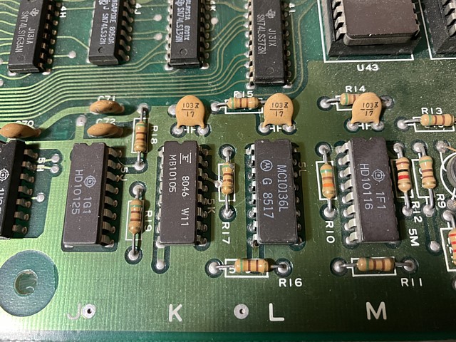 There were two other minor issues, the first was an intermittent glitchy dropout on the sprite characters which was most likely caused by a poor contact on one of the interconnecting ribbon cables. After rearranging the PCBs on the bench for testing and reconnecting the cabling that symptom has not recurred.