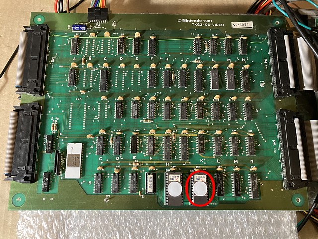 I've had a Donkey Kong (TKG3) board set on the bench for testing and a possible ROM revision change, for some time now and need to resolve what appears to be some missing colours or sprite details before moving on to the game software version. So far I've checked and verified major components EPROMs, RAM and colour palette PROMs are all working correctly.